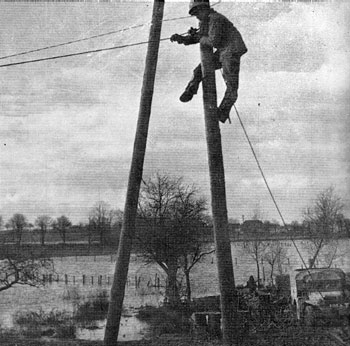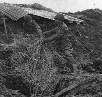 With straw to cushion the earthen floor, members of the 219th Field Artillery Battalion give their makeshift shelter all the comforts of a GI "Home" somewhere in France.