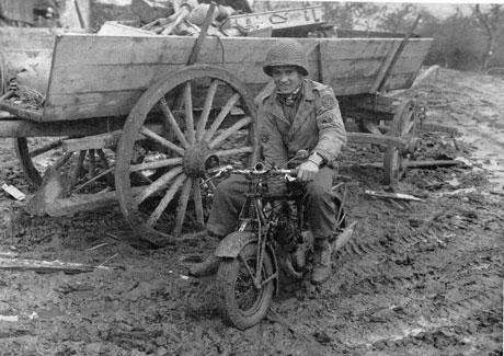 Member of Reconnaissance Company, 654th Tank Destroyer Battalion, attached to the 137th Infantry, shown with his captured German Paratroop motor bike which he picked up in the drive northeast of Nancy, France.