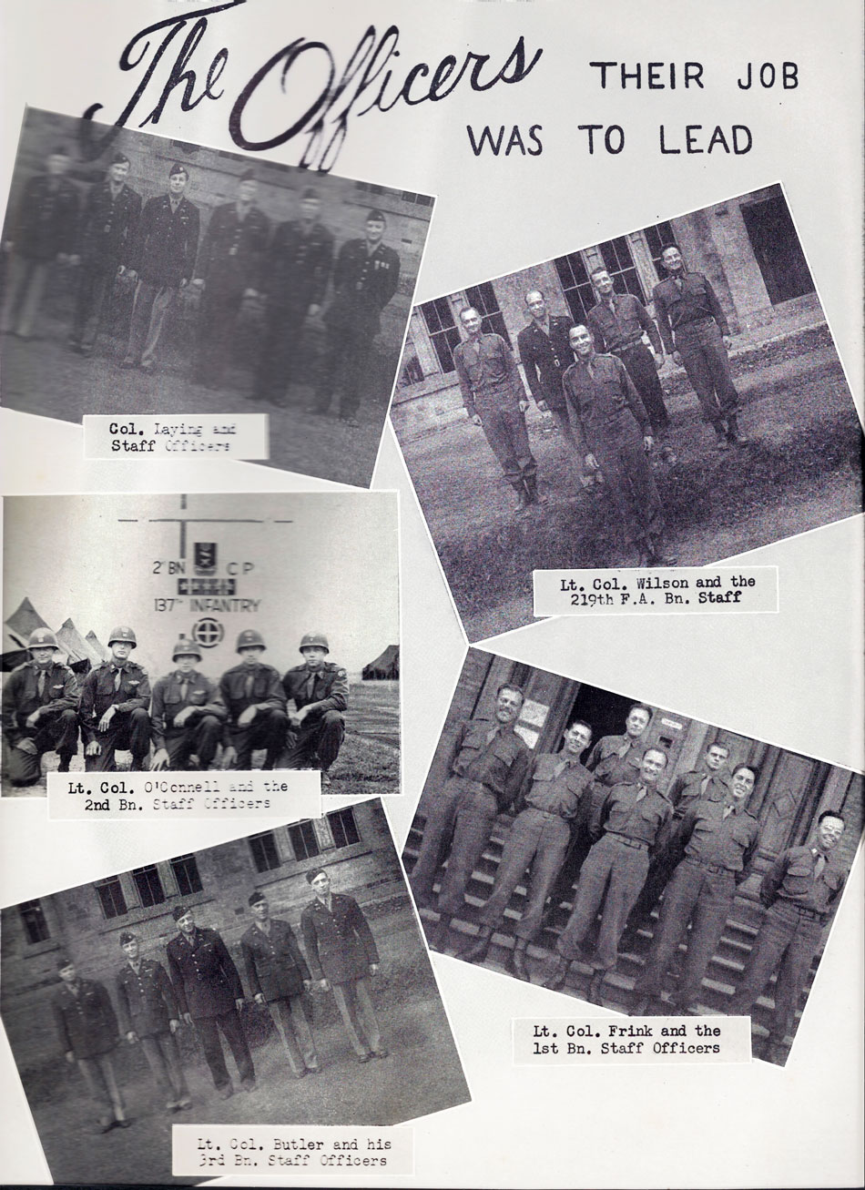 The Officers, Their job was to lead; Col. Laying and staff officers; Lt. Col. Wilson and the 219th Field Artillery Battalion Staff; Lt. Col. O'Connell and the 2nd Battalion staff officers; Lt. Col. Fink and the 1st Battalion staff officers; Lt. Col. Butler and his 3rd Battalion staff officers
