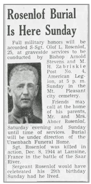 Olof Lekoy Rosenlof, son of Abner Hans and Margaret Inez (Dorsey) Rosenlof, was born September 12, 1919 in Mount Pleasant, Utah. He registered for the draft October 16, 1940 and was inducted into the Army November 11, 1942 at Salt Lake City, Utah. He served in Battery B, 161st Field Artillery Battalion, was promoted to Sergeant July 24, 1944 and to Staff Sergeant October 6, 1944. S/Sgt Olof L Rosenlof was killed in action December 8, 1944 in the vicinity of Sarreguemines, France. He was awarded a Silver Star Medal for gallantry during the battle in which he died. He is buried at Mount Pleasant City Cemetery, Mount Pleasant, Utah.