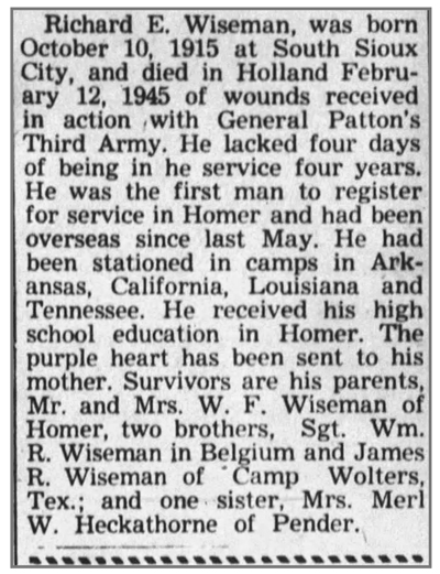 Richard Elbert Wiseman, son of William Fletcher and Ina A (Wight) Wiseman, was born October 10, 1915 in South Sioux City, Nebraska. He served in Headquarters Battery, 161st Field Artillery Battalion. He was seriously wounded by an artillery shell blast on February 12, 1945 in the vicinity of Randerath, Germany and was taken to the 105th Evacuation Hospital where he died of his wounds that same day. T/5 Richard E Wiseman is buried at Netherlands American Cemetery, Margraten, Netherlands.