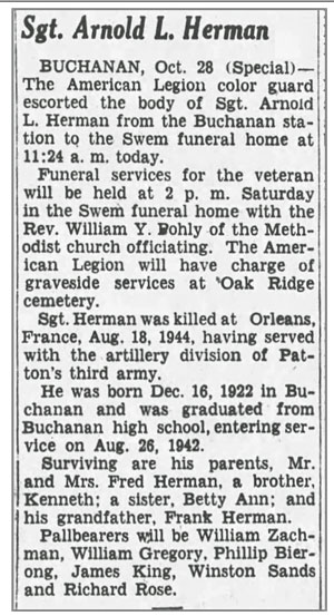 Arnold Lewis Herman, son of Frederick and Oral (Dick) Herman, was born December 16, 1922 in Buchanan, Michigan. He registered for the draft June 28, 1942. At the time he was working at Clark Equipment Company in Buchanan. He was inducted into the Army August 27, 1942 at Kalamazoo, Michigan and trained at Camp Roberts, California and Camp Rucker, Alabama before leaving for the ETO in February 1944. Sgt Arnold L Herman, a member of Battery B, 219th Field Artillery Battalion, was wounded by a shell blast August 18, 1944 in the vicinity of Orleans, France and died of his wounds that same day. He is buried at Oak Ridge Cemetery, Buchanan, Michigan.