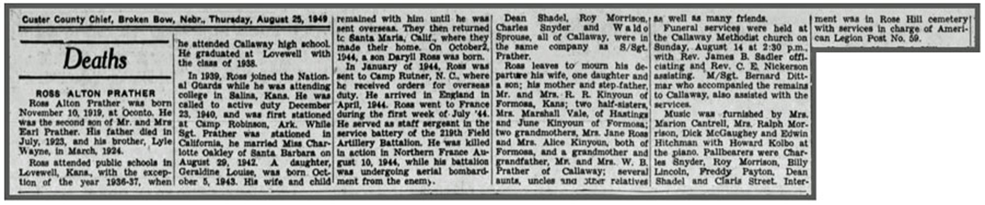 Ross Alton Prather, son of Harry Earl and Alma Emelia (Ross) Prather, was born November 10, 1919 in Oconto, Nebraska and moved to Kansas sometime between 1920 and 1930. He married Charlotte Edna Oakley August 29, 1942 and the couple had 2 children, a daughter Geraldine Louise and a son Daryll Ross. A member of the National Guard, he was mobilized for Federal service December 23, 1940 at Salina, Kansas and was a member of Service Battery, 219th Field Artillery Battalion. S/Sgt Ross A Prather was killed in action August 10, 1944 in the vicinity of Mortain, France when the artillery battery underwent an air attack during which both high explosive and anti-personnel bombs were dropped. He is buried at Rose Hill Cemetery, Callaway, Nebraska.