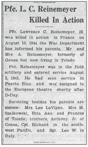 Lawrence Charles Reinemeyer, son of Anthony Joseph and Elizabeth Frances (Glaser) Reinemeyer, was born September 3, 1918 in Toledo, Ohio. He registered for the draft October 16, 1940. At that time he was 22 years old, living in Flint, Michigan and working at the Martin Rosenberger Wallpaper Store. He was inducted into the Army August 5, 1941 at Detroit, Michigan. He joined Service Battery, 219th Field Artillery Battalion sometime prior to mid-July 1944 and served as an ammunition handler. He was killed in action just south of Mortain, France when the Battery underwent an air attack just after midnight the morning of August 10, 1944. Both anti-personnel and high explosive bombs were dropped. Army hospital records indicate he was killed by aerial bomb fragments. Pfc Lawrence Charles Reinemeyer is buried at Calvary Cemetery, Toledo, Ohio.
