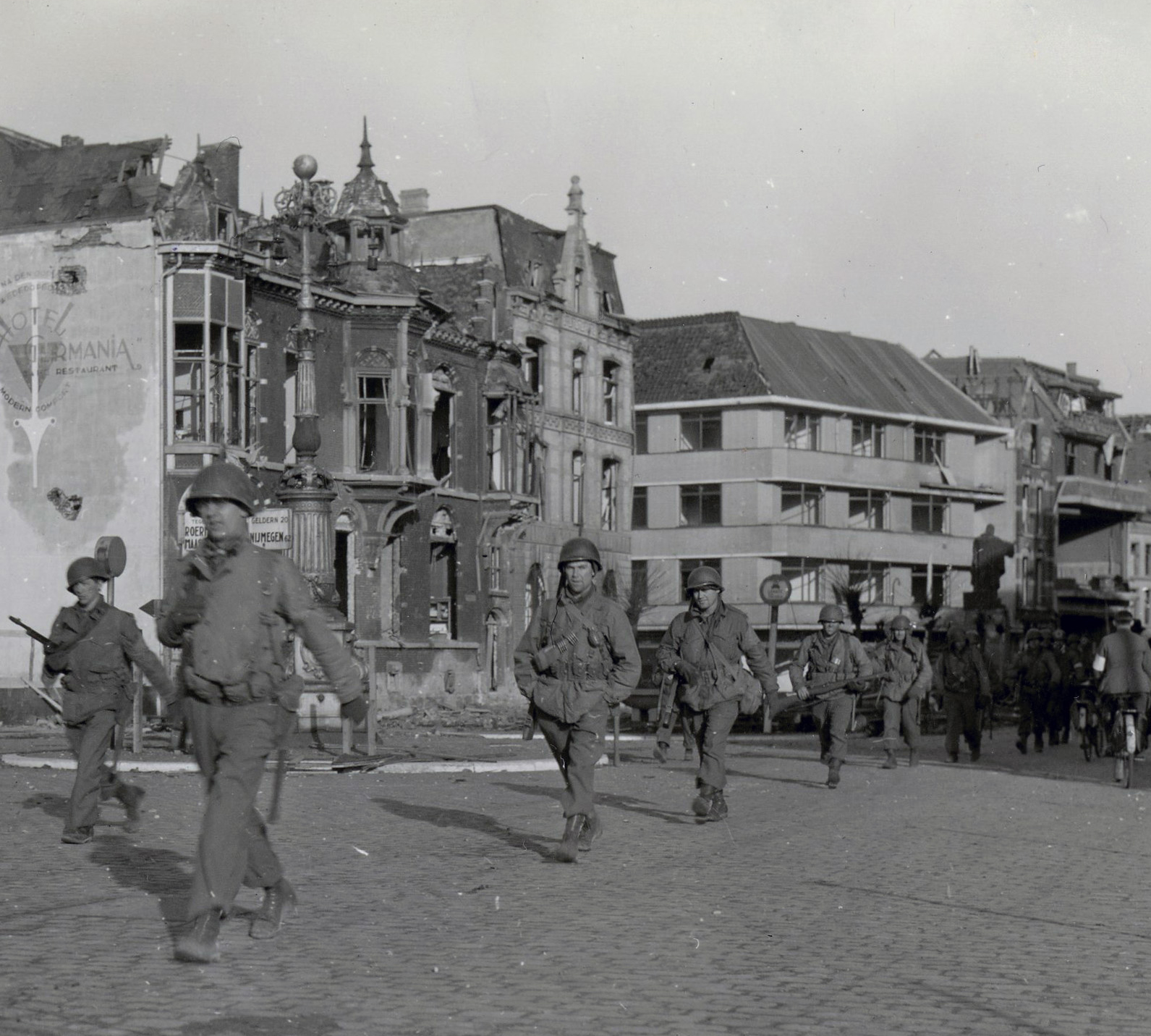 Troops of the 35th Infantry Division, Ninth U.S. Army, move through Venlo,