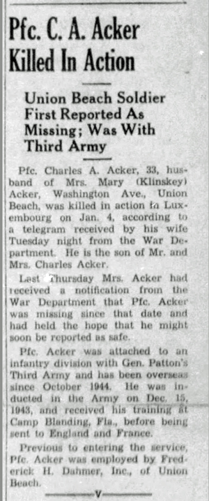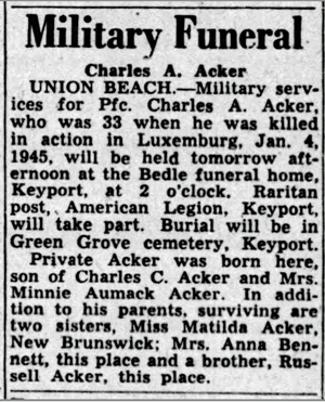 Pfc Charles A Acker was originally reported missing and was later confirmed killed in Action January 4, 1945 in the vicinity of Harlange, Luxembourg. He is buried in Green Grove Cemetery, Keyport, New Jersey.