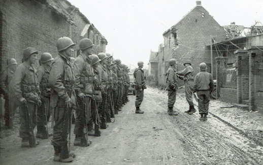 Presentation of Silver Star Medal by Col. Byrne, Straelen, Germany February 15, 1945 - View of Capt. Carey is blocked by the man standing to his right |