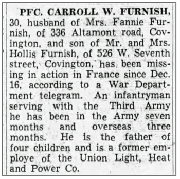 Carroll Weslen Furnish, son of Hollis and Lula Luella (Deppe) Furnish, was born March 4, 1915 in Covington, Kentucky. He was married to Francis "Fannie" Pearl Abdon and the couple had 4 children; Robert Lee, "Jean" Carol, Mary Lou, and Ronald Furnish. He registered for the draft on October 16, 1940. At that time he was working for the Union Light, Heat and Power Company in Covington.