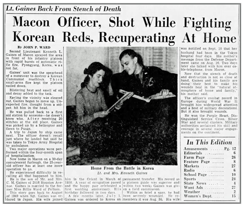 Sergeant Gaines reenlisted in the Army February 19, 1946 and fought in the Korean War. He was seriously wounded in action August 30, 1950 and was medically discharged from the Army February 29, 1952 at the rank of 2nd Lieutenant. He passed away November 5, 2008 at age 83 and is buried at White Chapel Memorial Gardens, Duluth, Georgia.
