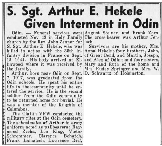 Arthur Edgar Hekele, son of Joseph Alois and Anna Agnes (Seus) Hekele, was born September 7, 1917 in Claflin, Kansas. He registered for the draft October 16, 1940. At that time he was working on a farm in Barton County, Kansas. He was inducted into the Army February 17, 1941 and served as a Squad Leader in Company B, 320th Infantry Regiment. He was awarded the Combat Infantryman Badge July 25, 1944. S/Sgt Arthur E Hekele was seriously wounded by a shell blast September 15, 1944 in the vicinity of Dombasle-sur-Meurthe, about 17 miles southeast of Nancy, France. He died of his wounds the same day. He is buried at Holy Family Cemetery, Odin, Kansas.