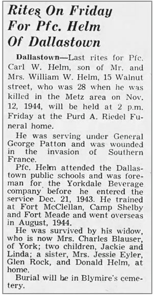 Carl William Helm, son of William and Gertrude (Waltimyer) Helm, was born November 24, 1915 in Dallastown, Pennsylvania. He married Mildred Marie McCoy August 25, 1939 and the couple had two children, a son Jack and a daughter Linda Marie. He registered for the draft October 16, 1940. At that time he was living in York, Pennsylvania and working at the Yorkdale Beverage Company in York. He was inducted in the Army November 30, 1943 in Harrisburg, Pennsylvania, entered active service December 21, 1943, and was stationed at Fort McClellan, Camp Shelby, and Fort Meade before departing for the ETO. He joined Company G, 320th Infantry Regiment as a Rifleman from the 38th Replacement Battalion on September 22, 1944 when the unit was at Arracourt, France and was promoted to Private First Class November 1, 1944. Pfc Carl W Helm was killed in action by fragments from a shell blast November 12, 1944 in the vicinity of Chateau-Salins, France. He is buried at Saint John's Blymire UCC Cemetery, Dallastown, Pennsylvania.