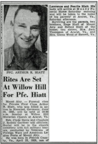 Private First Class Arthur R. Hiatt was killed in action June 25, 1945. Four