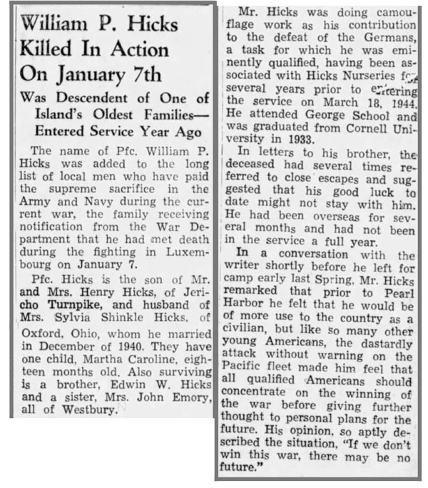 William Preston Hicks, son of Henry and Caroline Underhill (Jackson) Hicks, was born on November 30, 1910, in Westbury, New York. In December 1940, he married Sylvia Shinkle, and the couple had one daughter, Martha Caroline. He registered for the draft on October 16, 1940. At the time, he was employed at Hicks Nursery, Inc., in Westbury. He was inducted into the Army on April 18, 1944, at Romulus, New York. He was assigned to Company G, 320th Infantry Regiment, as a rifleman and joined the unit from the 38th Replacement Battalion on November 13, 1944, while the unit was at Pevange, France. On December 1, 1944, he was promoted to Private First Class and awarded the Combat Infantryman Badge. Pfc William P Hicks was killed in action on January 7, 1945, southeast of Harlange, Luxembourg. He is buried at the Luxembourg American Cemetery in Hamm, Luxembourg