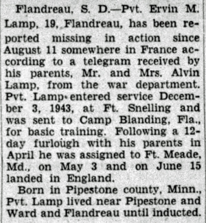 Ervin Michael Lamp, son of Alvin John and Catherine Esther (Carpenter) Lamp, was born February 14, 1925 in Pipestone County, Minnesota. He registered for the draft February 15, 1943. At the time he was living in Flandreau, South Dakota. He was inducted into the Army December 3, 1943 at Fort Snelling, Minnesota and joined Company C, 320th Infantry Regiment as a Rifleman from the 41st Replacement Battalion July 13, 1944 when the unit was in the vicinity of St Lo, France. Pvt Ervin M Lamp was reported missing August 11, 1944 in the vicinity of Mortain, France and was later confirmed killed in action on that date. He is buried at Brittany American Cemetery, Saint James, France.