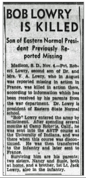 Robert Charles Lowry, son of Vayne Arnold and Daisy Viola (Easterday) Lowry, was born February 6, 1923 in Madison, South Dakota. He registered for the draft June 30, 1942 while working in the Civilian Conservation Corps at Hill City, South Dakota. He was inducted into the Army January 23, 1943 and served in Company D, 320th Infantry Regiment. Pfc Robert C Lowry was initially reported missing August 12, 1944 in the vicinity of Mortain, France and was later confirmed killed in action on that date. He was posthumously awarded the Combat Infantryman Badge August 20, 1944. He is buried at Brittany American Cemetery, Saint James, France.