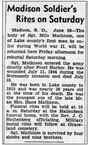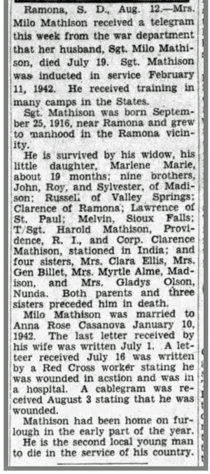 Milo Wilbur Mathison, son of Hans Martin and Marit "Mary" (Elshang) Mathison, was born September 25, 1915 in Ramona, South Dakota. He married Anna Rose Casanova in 1942 and the couple had a daughter, Marlene Marie. He was inducted into the Army February 11, 1942, served in Company E, 320th Infantry Regiment and in 1943 he was awarded the American Campaign Service Medal for service in Canada. He landed at Omaha Beach Normandy France, July 6, 1944. S/Sgt Milo W Mathison was wounded in action July 11, 1944 just north of St Lo, France and died of his wounds July 19, 1944. He is buried at Graceland Cemetery, Madison, South Dakota.