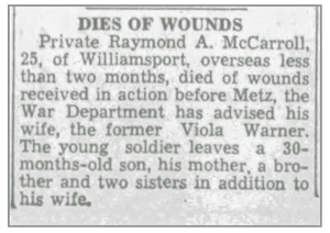 Raymond Arlington McCarroll, son of Lewis and Olive Myrtle (Ryder) McCarroll, was born April 1, 1919 in Pennsylvania. He married Viola Warner September 8, 1940 and the couple had a son Raymond, born in 1942. He registered for the draft October 16, 1940. At the time he was living in Williamsport, Pennsylvania and working at Armour Leather Company in Newberry. He was inducted into the Army March 25, 1944 and joined Company K, 320th Infantry Regiment as a Rifleman from the 71st Replacement Battalion October 4, 1944. Pvt Raymond A McCarroll was wounded in action November 8 by a land mine explosion in the vicinity of Fresnes-en-Saulnois, France and died of his wounds the following day, November 9, 1944. He is buried at Montoursville Cemetery, Montoursville, Pennsylvania.