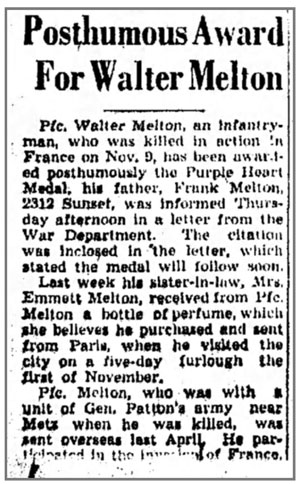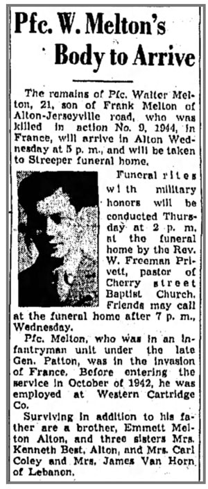 Walter L Melton, son of Franklin Roy and Theresa (Richter) Melton, was born November 18, 1922 in Illinois. He was inducted into the Army September 29, 1942 at Peoria, Illinois and was an Antitank Gun Crewman in Cannon Company, 320th Infantry Regiment. He was killed in action November 9, 1944 in the vicinity of Chateau-Salins, France. Pfc Walter L Melton is buried at Oakwood Cemetery, Alton, Illinois.