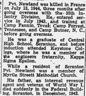Philip John Newland, Jr, son of Philip John Senior and Roxie (Edwards) Newland, was born April 30, 1924 in the District of Columbia. He registered for the draft June 30, 1942. At the time he was living in Lackawanna, Pennsylvania. He was inducted into the Army July 14, 1943 at Wilkes Barre, Pennsylvania. He was a member of Company I, 320th Infantry Regiment and landed at Omaha Beach in Normandy, France July 6, 1944. Pvt Philip J Newland, Jr was killed in action July 13, 1944 in the vicinity of St Lo, France. He is buried at Hanover Cemetery, Hanover, Pennsylvania.