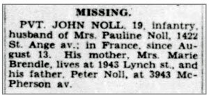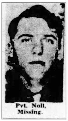 John Noll, son of Peter Joseph and Sylvia (Rentfro) Noll, was born March 26, 1925 in St Louis, Missouri. He registered for the draft March 29, 1943 and was inducted into the Army July 5, 1943 at Jefferson Barracks, Missouri. He joined Company K, 320th Infantry Regiment as a Rifleman from the 86th Replacement Battalion, August 2, 1944 when the unit was in the vicinity of St Lo, France. Pvt John Noll was originally reported missing August 13, 1944 in the vicinity of Mortain, France and was later confirmed killed in action on that date. He is buried at Brittany American Cemetery, Saint James, France.