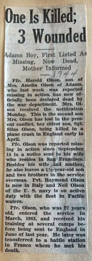 Harold Clayton Olson, son of Nels and Amelia Caroline (Anderson) Olson, was born June 25, 1917 in Adams, North Dakota. He married Elizabeth Irene Campbell November 7, 1940 and the couple had one son. He registered for the draft October 16, 1940. At the time he was living in Willows California. He was inducted into the Army March 23, 1943 at San Francisco and joined Company G, 320th Infantry Regiment from the 92nd Replacement Battalion July 24, 1944 when the Regiment was about 3 miles east of St Lo, France. Pfc Harold C Olson was originally reported missing September 14, 1944 in the vicinity of Hudivillier, southeast of Nancy, France and was later confirmed killed in action on that date. He is buried at West Adams Cemetery, Adams, North Dakota.