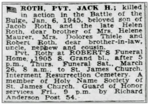 Jack Hubert Roth, son of Jacob John and Helen Mary (Toennemann) Roth, was born September 29, 1925 in St Louis, Missouri. He registered for the draft September 29, 1943. At the time he was a student at Southwest High School and worked part time at A P Bakery in St Louis. He was inducted into the Army March 23, 1944 at Jefferson Barracks, Missouri and joined Company L, 320th Infantry Regiment from the 38th Replacement Battalion November 17, 1944 serving as a Rifleman. He was awarded the Combat Infantryman Badge December 1, 1944. Pvt Jack H Roth was reported missing in action in the vicinity of Baschleiden, Luxembourg southeast of Bastogne and was later confirmed killed in action January 6, 1945. He is buried at Resurrection Cemetery, Affton, Missouri.