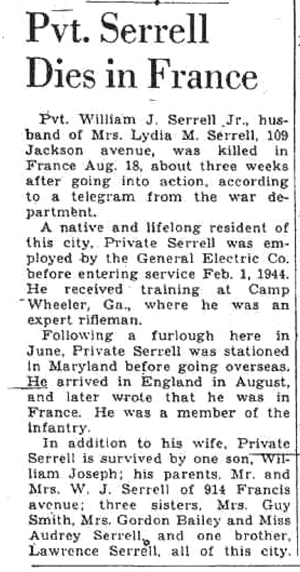 William John Serrell, Jr, son of William John and Bessie Mae (Golden) Serrell, was born June 11, 1911 in Schenectady, New York. He married Lydia Molnar October 24, 1936 and the couple had a son, John Serrell born June 10 1943. He registered for the draft October 14, 1940, was inducted into the Army February 1, 1944, and received his basic training at Camp Wheeler, Georgia. He joined Company C, 320th Infantry Regiment from the 48th Replacement Battalion on August 9th and was killed in action 4 days later on August 13, 1944 in the vicinity of Mortain, France. He was posthumously awarded the Combat Infantryman Badge August 20, 1944. Pvt. William J. Serrell, Jr is buried at Most Holy Redeemer Cemetery, Niskayuna, New York.