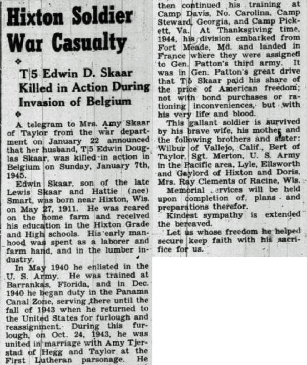 Edwin Douglas Skaar, son of Lewis and Hattie Irene (Smart) Skaar, was born May 22, 1911 in Hixton, Wisconsin. He was inducted into the Army May 20, 1940 at Albion, Michigan and married Amy Tjerstad on October 24, 1943. He joined Company C, 320th Infantry Regiment from the 14th Replacement Battalion December 23, 1944. T/5 Edwin D Skaar was killed in action January 7, 1945 in the vicinity of Remoifosse, Belgium, south of Bastogne. He is buried at Trinity Rest Cemetery, Hixton, Wisconsin.