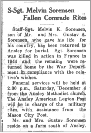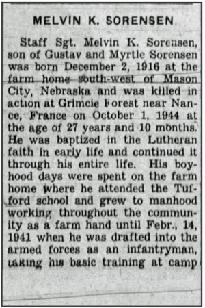 Melvin Kenneth Sorensen, son of Gustav Adolf and Myrtle (McNair) Sorensen, was born December 2, 1916 in Mason City, Nebraska. He registered for the draft October 16, 1940 and was inducted into the Army February 14, 1941. A Squad Leader in Company M, 320th Infantry Regiment, he was wounded in action July 30, 1944 southeast of St Lo, France but remained on duty. He was awarded the Combat Infantryman Badge July 31, 1944. S/Sgt Melvin K Sorensen was killed in action October 1, 1944 by artillery shell fragments in the vicinity of the Foret de Gremecey, west of Chateau Salins, France. He is buried at Ansley Cemetery, Ansley, Nebraska.