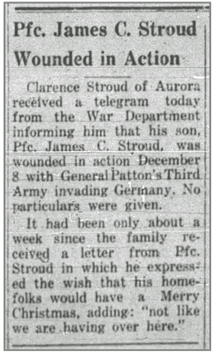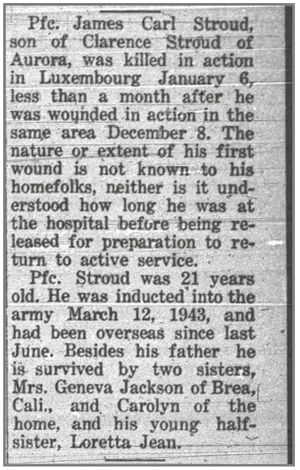 James Carl Stroud, son of Clarence and Edith (Haney) Stroud, was born October 9, 1923 in Huntsville, Arkansas. He registered for the draft June 30, 1942, was inducted into the Army in March 1943, and joined Company L, 320th Infantry Regiment from the 86th Replacement Battalion on July 30, 1944. He was awarded the Combat Infantryman Badge August 20 and promoted to Private First Class October 4, 1944. He was wounded in action by artillery shell fragments December 8, 1944 in the vicinity of Wittring, France on the west bank of the Saar River and returned to duty December 19, 1944. Pfc James C Stroud was killed in action January 6, 1945 in the vicinity of Baschleiden, Luxembourg, southeast of Bastogne, Belgium. He is buried at Luxembourg American Cemetery, Hamm. Luxembourg.