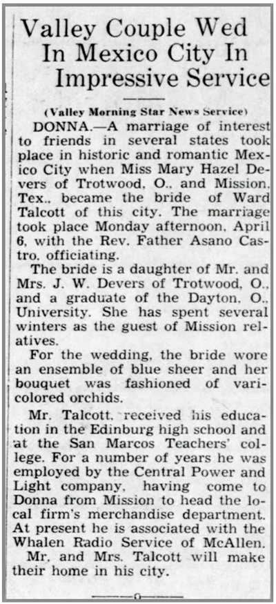Ward Talcott, son of Harry and Edith (Wuerfele) Talcott, was born January 27, 1913 in Hutchinson, Kansas. He moved to Texas sometime between 1928 and 1930 and married Mary Hazel Devers on April 6, 1936. He registered for the draft October 16, 1940. At the time he was living in Lebanon, Ohio and working at The Handigas Company of Ohio. 2nd Lt Ward Talcott served as an Infantry Unit Commander in Company E, 320th Infantry Regiment. Originally reported missing, it was later confirmed that he had been killed in action July 28, 1944 in the vicinity of St Lo, France. He is buried at Normandy American Cemetery, Colleville-sur-Mer, France.