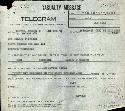 Sgt Robert D Tester was killed aboard the troopship HMT Rohna off the coast of Bougie, Algeria when it was struck by a German guided missile on November 26, 1943. Originally reported missing, he was later confirmed killed in action when his body washed ashore. Although Sgt Tester was assigned to a replacement detachment at the time of his death, he had not yet received a permanent assignment and is recorded as a 320th Infantry Regiment war casualty. He was originally interred at the U.S. Military Cemetery at El Alia, Algeria. At his mother's request was reinterred and is now buried next to two of his brothers at Henri-Chapelle American Cemetery, Liege, Belgium.