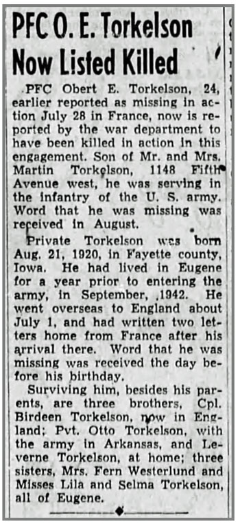 Obert Edwin Torkelson, son of Martin and Elizabeth (Walvatne) Torkelson, was born August 24, 1920 in West Union, Iowa. He registered for the draft February 16, 1942. At the time he was living in Eugene, Oregon and working at the State Board of Higher Education. He was inducted into the Army August 24, 1942 at Portland Oregon. He joined Company K, 320th Infantry Regiment from the 86th Replacement Battalion on July 14, 1944 and served as a Rifleman. Pfc Obert E Torkelson was reported missing July 28, 1944 in the vicinity of Torigni Sur Vire, south of St Lo, France. It was later confirmed that he had been killed in action. He is buried at Brittany American Cemetery, Saint-James, France.