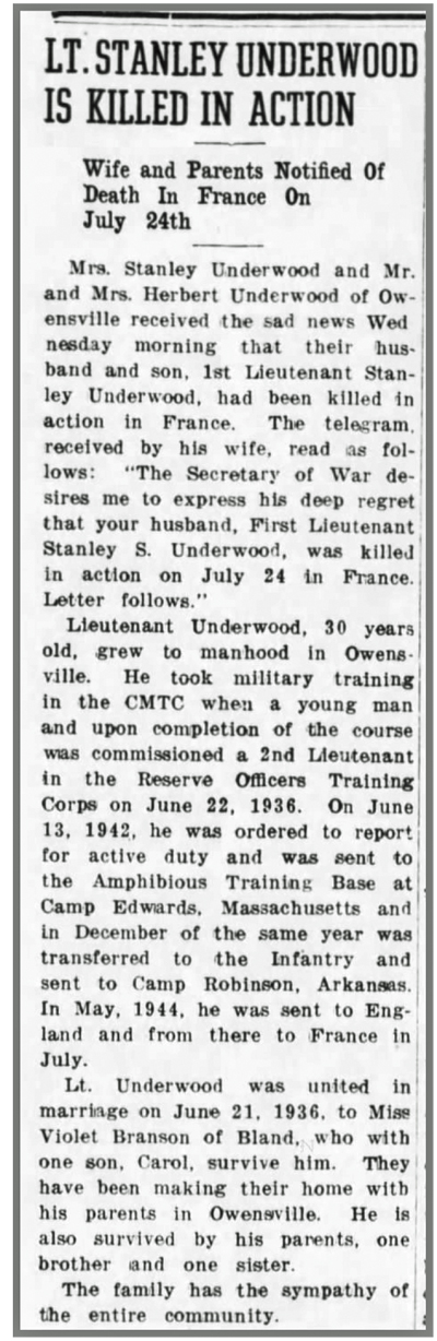 Stanley S Underwood, son of Herbert and Elora (Stanley) Underwood, was born October 19, 1914 in Missouri. He married Violet Marie Branson July 30, 1936 and the couple had a son, Carol. 1st Lt Stanley S Underwood served as an Infantry Unit Commander in Company E, 320th Infantry Regiment. He was killed in action July 24, 1944 in the vicinity of St Lo, France and is buried at Owensville City Cemetery, Owensville, Missouri.