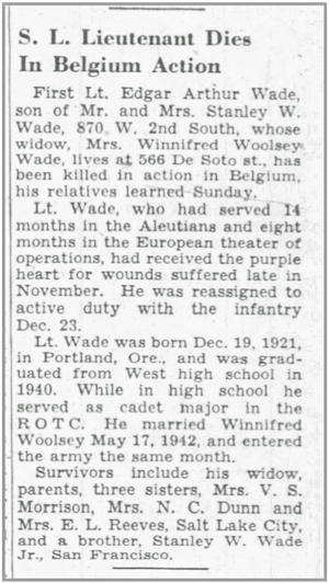 Edgar Arthur Wade, son of Stanley William and Florence (Hoyt Sears) Wade, was born December 19, 1921 in Portland, Oregon. The family moved to Utah sometime before 1930. He graduated West High School in Salt Lake City in 1940. While in high school he served in the R.O.T.C. He registered for the draft February 16, 1942. At the time he was employed at Auerbach Dry Goods in Salt Lake. He married Winnifred Woolsey on May 17 and left for Camp Roberts, California three days later May 20, 1942. He entered the Army as a 2nd Lieutenant, was promoted to 1st Lieutenant July 23, 1943, and served in the Aleutian Islands before being assigned to the ETO.