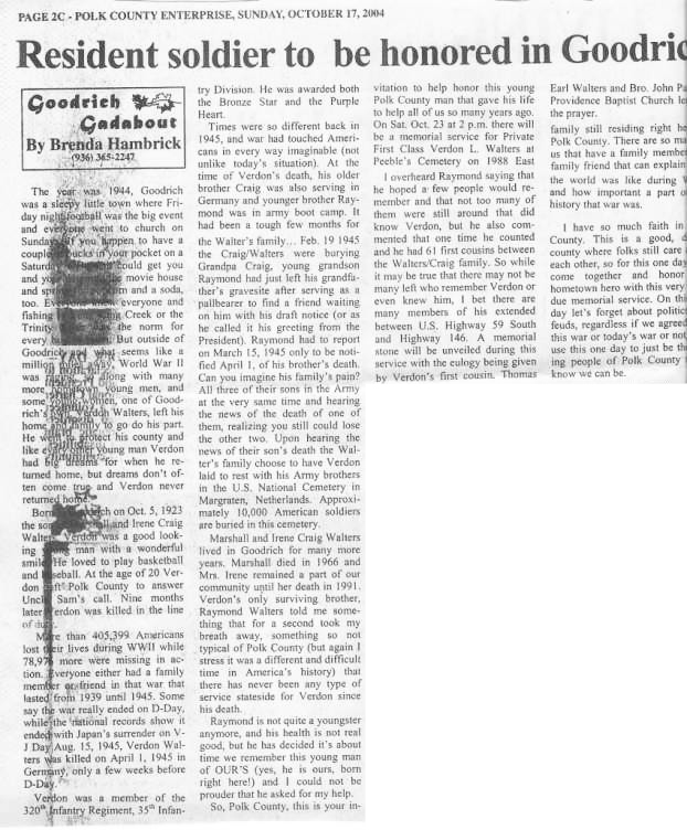 Verdon Lucian Walters, son of Marshall Thomas and Irene (Craig) Walters, was born October 5, 1923 in Cold Springs, Texas. He joined Company G, 320th Infantry Regiment from the 83rd Replacement Battalion on January 17, 1944 and served as a Rifleman. He was promoted to Private First Class February 1, 1945. Pfc Verdon L Walters was killed in action April 1, 1945 in the vicinity of the Emscher and Rheine-Herne Canals near Dortmund, Germany. He is buried at Netherlands American Cemetery, Margraten, Netherlands.