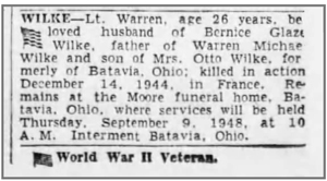 Warren Edward Wilke, son of Otto Heinrich and Martha Louise (Edwards) Wilke, was born in Wisconsin November 2, 1918. He attended the University of Wisconsin at Madison, graduating in 1940. He married Bernice Glaze. The couple resided in Ohio and had a son, Warren Michael Wilke. He entered service January 14, 1942. He joined Company I, 320th Infantry Regiment from the 38th Replacement Battalion on November 20, 1944. He was seriously wounded in action December 14, 1944 in the vicinity of Bliesbruck, France and died of his wounds that same day. 1st Lt Warren E Wilke is buried at Batavia Union Cemetery, Batavia, Ohio.
