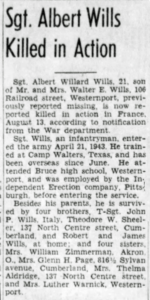 Albert Willard Wills, son of Walter Edward and Lottie Matilda (Walter) Wills, was born September 21, 1923 in Westernport, Maryland. He registered for the draft June 29, 1942 and was inducted into the Army April 13, 1943 at Baltimore, Maryland. He joined Company K, 320th Infantry Regiment July 22, 1944 and served as a Rifleman. Originally reported missing in action in the vicinity of Mortain, France, it was later confirmed that he had been killed in action August 13, 1944. Pvt Albert W Wills is buried at Rose Hill Cemetery, Cumberland, Maryland.