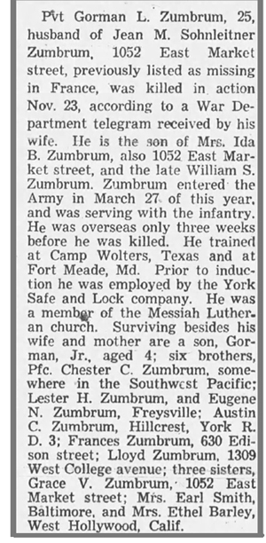 Gorman Luther Zumbrum, son of William Scott and Ida Belle (McCarthy) Zumbrum, was born in York, Pennsylvania. The birthdate listed on his draft registration is October 17, 1919, but the birthdate on his headstone is October 22. He married Jeanie Mary Schnleitner July 6, 1940 in Stafford, Virginia. The couple had one child, a son Gorman, Jr., born March 1, 1941. He registered for the draft July 1, 1941. At that time, he was employed by York Safe and Lock. He was inducted into the Army on March 27, 1944 at Fort Meade, Maryland and trained at Camp Wolters, Texas and Fort Meade.
