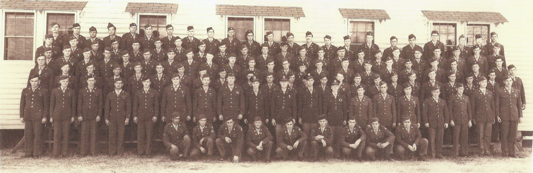 BACK ROW, 6th from left Oswald R. Dudley; 7th from left Lorens Woodside; 8th from left Robert Winter. THIRD ROW FROM FRONT, 11th from left Marvin Cain. Identities of other soldiers unknown