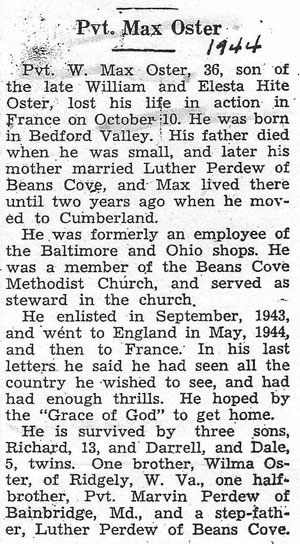 William "Max" Oster, son of William Cessna and Elesta Belle (Hite) Oster, was born in Bedford County, Pennsylvania January 5, 1908. He married Margaret Blanche Perdew in March 1930 and the couple had 3 sons, Richard, Dale and Darrell. He registered for the draft October 16, 1940. At the time he was living in Allegheny, Maryland and working for the WPA Project in Altoona, Pennsylvania. He was inducted into the Army September 9, 1943 at Baltimore, Maryland and assigned to Company B, 60th Engineers Combat Battalion. He departed the U.S. on May 12, 1944 and landed in England two weeks later where the 60th Engineers were based at St. Tudy, Cornwall. On July 5 he embarked for Normandy, France landing on Omaha Beach July 7, 1944.