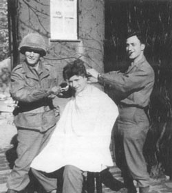 Bill Hershefield (Hersey), Armando Baglione (Baggy) and Andrew Scala (right) cutting hair |