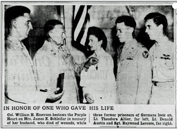 James Elmer Schleifer, son of Elmer Joseph and Elizabeth (Vierow) Schleifer, was born November 8, 1915 in Rochester, New York. He married Jeanette Tracy June 21, 1941 and the couple had a son, James Thomas, born November 15, 1942. He registered for the draft October 16, 1940 and was inducted into the Army March 6, 1943 at Rochester, New York. He joined Company B, 60th Engineer Combat Battalion from the 38th Replacement Battalion on October 14, 1944. Pvt James E Schleifer was killed in action by artillery shell fragments December 10, 1944 in the vicinity of Sarreguemines, France. He is buried at Holy Sepulchre Cemetery, Rochester, New York.