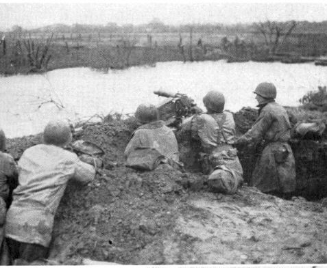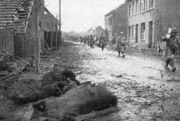 In moving northward, the 134th Infantry not only was leaving the 6th Armored Division, but the III Corps and the Third Army, and even General Bradleys 12th Army Group. It was on its way to rejoin its own 35th Division and the Ninth Army of its old division commander Lieutenant General William H. Simpson, (and the 21st Army Group of Field Marshal Bernard L. Montgomery). There were cloudy skies and some light rain as the column proceeded, 1 February, through Bastogne, Marche, Liege, to the area around Gravenvoeren Belgium (about eight miles south of Maastricht, Holland). Five days later - days of training (including a training film on non-fraternization with the enemy), USO shows, clubmobiles, movies - the Regiment resumed its journey northward to relieve the British 155th Infantry Brigade (52nd Division) in the quagmire of Bocket, Germany, and vicinity. Here it went into position while the 137th and 320th Regiments went into the line behind the series of streams paralleling the Roer River in the vicinity of the thoroughly destroyed city of Heinsberg. This was the northern flank of American forces in Europe.