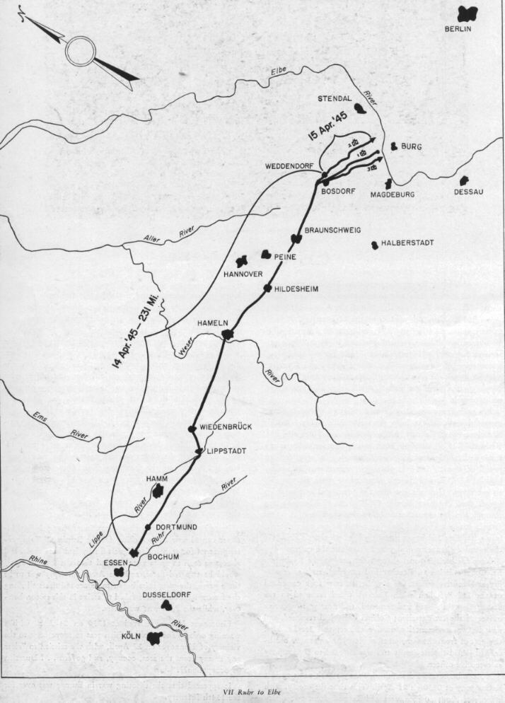 Originally there was no corps restraining line, and, in view of the bridgeheads which had been effected to the south, it appeared that the Regiment might be scheduled for a role in the final drive for Berlin (G Company now was within 12 miles of the Reich capital). But, to the disappointment of practically no one in the Regiment, that was not to be; there was to be no advance beyond the Elbe in this sector.