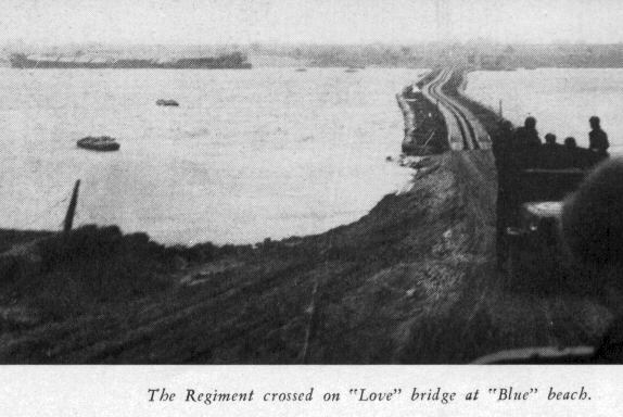 The crossing site (near Rheinberg) had the appearance of Omaha Beach. There were barrage balloons, and busy aircraft, and engineers at work maintaining roadways, and supply trucks moving about. Soon after arrival of the Regiment in the Rheinberg area, where the line companies detrucked, orders came for an immediate crossing of the river. Night was falling as the 3rd, 1st, 2nd Battalions marched across the great pontoon "Love" bridge at "Blue" beach (commanders had preceded the foot troops in order to make reconnaissance), and even the night sky assumed a look similar to that of the first night in Normandy when airplanes of the Luftwaffe exchanged colorful streams of tracers with anti-aircraft guns near the bridge.