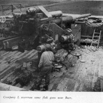 About three kilometers to the east of Gladbeck lay Buer, a city of about 100,000, and it was next for the 134th Infantry - with an attacking force of about 1,200. Again with the 3rd Battalion on the right, and the 2nd on the left, the Regiment jumped off at 0700 (30 March). Defenses were of the same nature as those which had been encountered previously - islands of resistance, but no well-coordinated defensive line. Here at least units could apply the technique of maneuver against flanks, and employment of bases of fire to cover movement in the manner with which they had familiarized themselves in pre-combat training. In the 3rd Battalion Lt. Warren Hodges I Company made a wide swing to the right, through a factory area, while L Company, with K close behind, advanced generally along the main road. At 0820, with the battalion half way to its goal, small arms fire held up Company L, but, once that was overcome, it continued rapidly to the outskirts of Buer, overrunning five emplaced 128mm anti-aircraft guns (and capturing their crews - members of the 4th and 7th Flak Divisions) in the process. But then there was further small arms fire. A strong point in the vicinity of the town hall was reduced with the assistance of fire from supporting tanks and TDs, but advance could continue only with the greatest difficulty. At about this time, as Colonel Wood was going forward to confer with Captain Brigandi of Company L on what measures might contribute to an early completion of the task at hand, Pfc. Henry Alonzo of the L Company light machine gun section, come running up to the company commander.