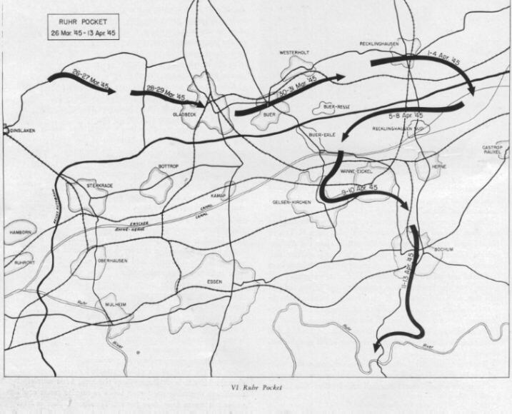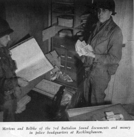 That same day the Regiment received the news that units of the First and Ninth Armies had linked up near Lippstadt to complete what General Marshall called "the largest pocket of envelopment in the history of warfare." Now cut off from the outside, there remained within the Ruhr 300,000 soldiers of German Army Groups B and H.