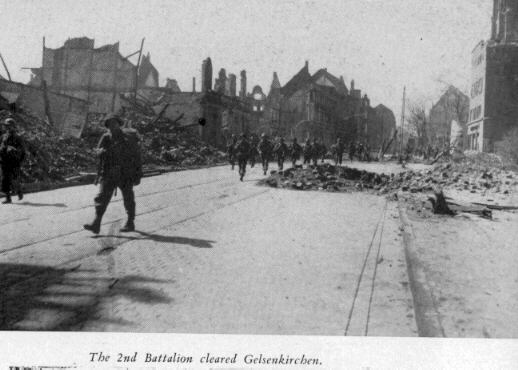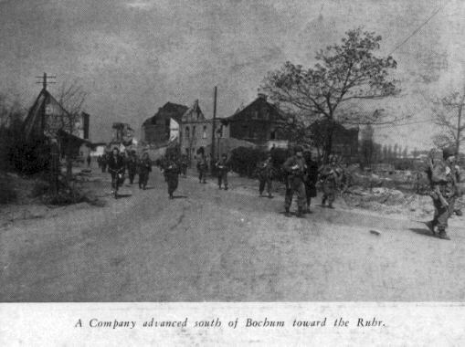 Little serious opposition developed the next day as the 2nd Battalion cleared Gelsenkirchen (population 313,000) and guarded the rear areas, and the 1st and 3rd Battalions continued their advance through Rottbruch, Riemke, Hofstede, Eickel, Rohlinghausen, Ecelbruch. Nor was there anything more than scattered resistance as those battalions passed through the 313th Infantry (79th Division) and advanced south from Bochum (population 303,000) 11 April, and continued southward through Weitmar, Weitmar-Mark, Neuling Haarl, Weitmar Holz, Sundern, Brockhausen, Stiepel, and reached positions on the scenic, garden-spotted heights overlooking the Ruhr River. Artillery observers had another "field day" late in the afternoon against widespread enemy activity south of the river - and there were some German replies in kind.