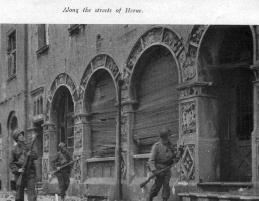 In order to take advantage of the early morning haze in launching an attack against the positions which had been so troublesome for the 2nd Battalion, Colonel Wood asked permission to move up the time of attack for 3rd Battalion to 0630. That granted, the men of 3rd Battalion marched out of Westerholt at 0445 in order to get to the area of departure at Stuckenbusch in time for the attack. Jeeps carried the heavy weapons as far as Backum. First objective for the battalion was Hochlar, but it was to be prepared to continue the attack to the northeast toward the major city of Recklinghausen. In the face of intense machine gun and mortar fire from the vicinity of the railroad just east of Stuckenbusch, Companies I and K fought their way forward. They were well through Hochlar at 0830, and, with a regimental order to go for Recklinghausen, the sizable task of mopping up Hochlar was left to L Company while the others moved out to the open, gently sloping ground toward Recklinghausen. A city of about 87,000, Recklinghausen was an important communication center and a center of Nazi activity. But, as the 3rd Battalion troops fought toward it, they encountered for the first time what seemed to be a coordinated defense line. (Actually it was a part of the same line of resistance which was holding up the 1st Battalions attack on the right.) Heavy concentrations of fire - including at least 500 rounds of time, percussion, and white phosphorous fired in successive volleys of battalion strength by the 161st Field Artillery - and determined movement forward - broke the defense line. Observers reported the withdrawal of enemy troops and two horse-drawn guns. Colonel Schuster, commander of the 161st, happened to be at the 3rd Battalion O.P. at the time, and he called for heavy artillery concentrations which practically turned the withdrawal into a rout. During the preceding night, the artillery had poured over 4,000 rounds into the Recklinghausen area, and, since H-hour, time on target fires of three to four battalions had been falling on the city every 15 minutes. Supporting tanks and tank destroyers moved up, and Company I made a wide swing to the right to go into the city from the south (along Herner Strasse), while K, with L following, moved in from the southwest. Before 1300 the companies had reached the streets following the course of the wall which once had surrounded the old city. A Mark IV tank still was burning in the square. A captured German officer attributed the fall of the city to "an excellent executed attack; artillery followed closely by infantry and tanks."